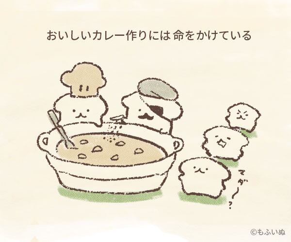 ミリもふは、いつものほほんとしているもふいぬの世界を守るべく進化したもふいぬです。でも防衛については勉強中なので、とりあえず海軍カレーを作る事から始めるみたいです。