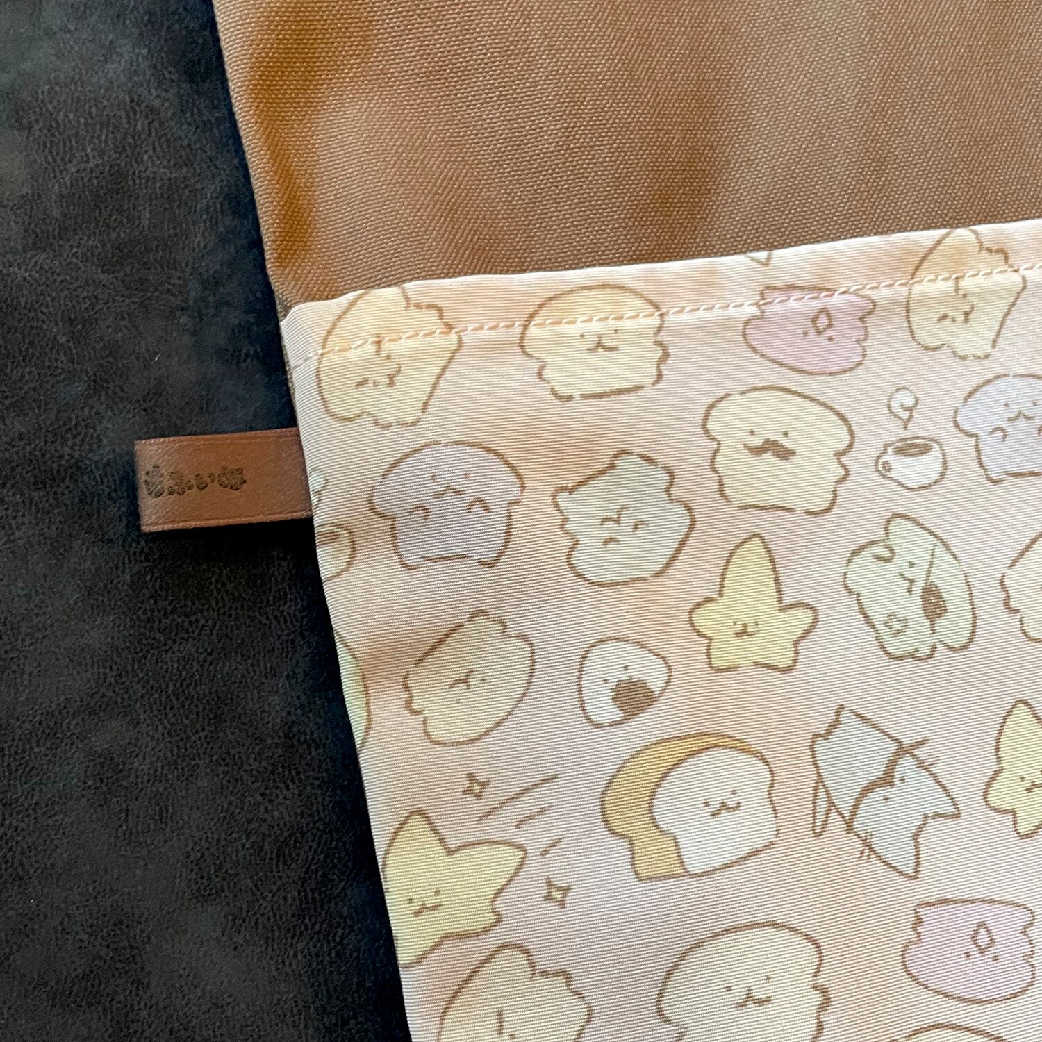もふいぬ達がわいわい!しているイラストをプリントした生地を作り、大きなポケットにしました。